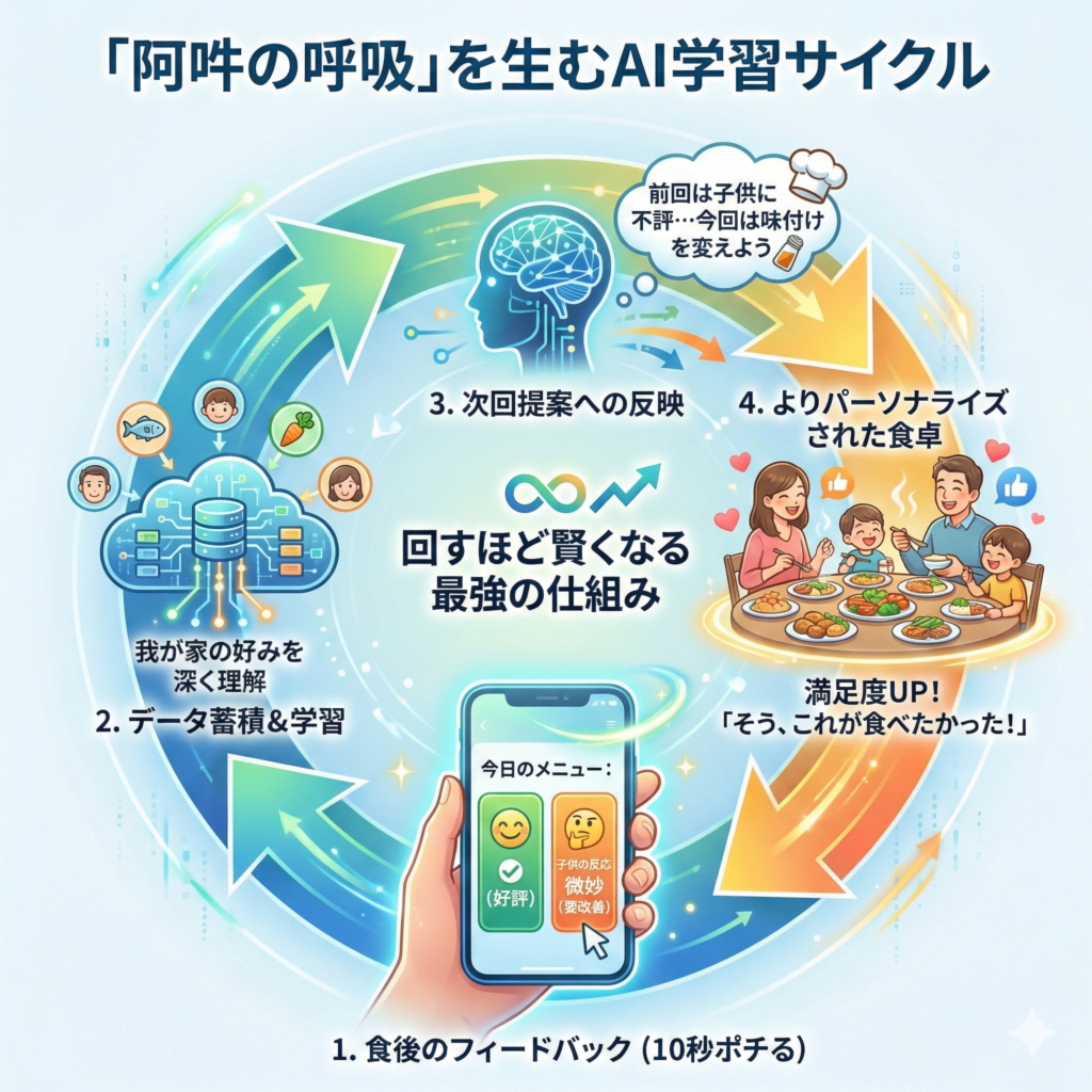 さらに、このシステムには「学習機能」も持たせました。 食後にスマホで「今日のメニュー:◎」「子供の反応:微妙」と10秒ポチッとするだけで、データが蓄積されていきます。