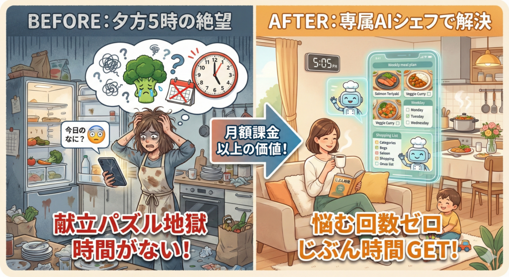 「毎週このプロンプトをコピペして、冷蔵庫の中身を入力するのすら面倒くさい……」 「食べた後の家族の感想を、もっと簡単に次の献立に活かしたい……」